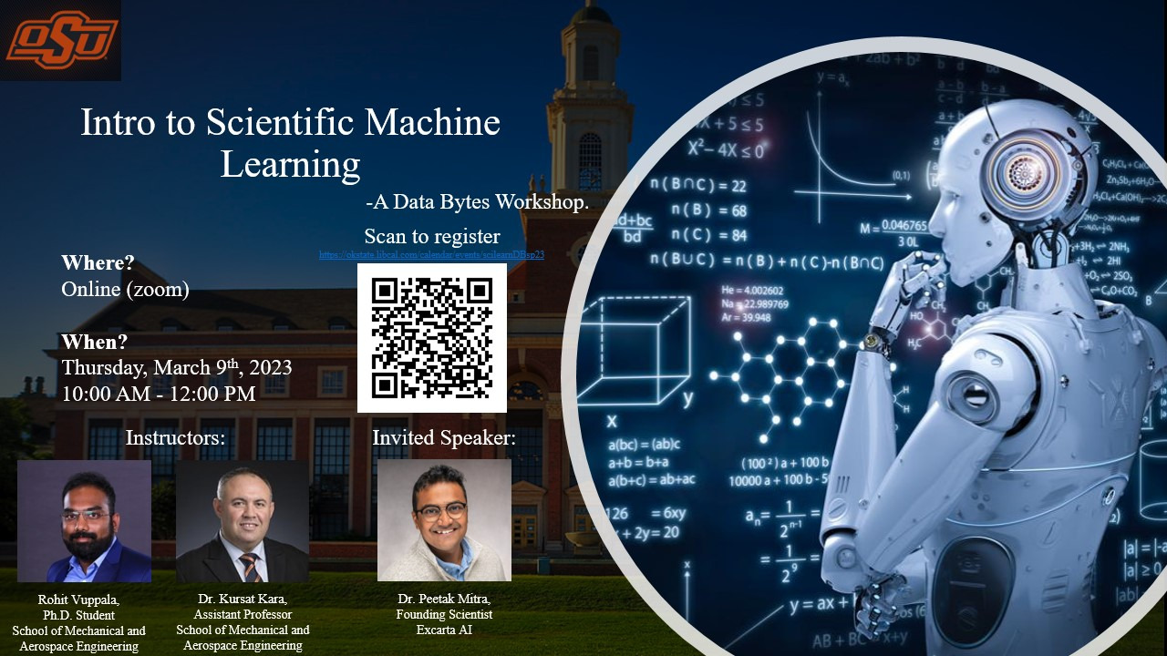 - - March 9, 2023 : We successfully conduct an "Intro to Scientific Machine Learning" workshop as part of DataByte workshop series, Edmon Low library, OSU.